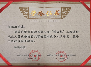我司閆淑敏獲得《內(nèi)蒙古自治區(qū)第三屆“慧云杯”工程造價(jià)從業(yè)人員業(yè)務(wù)技能大賽》個(gè)…