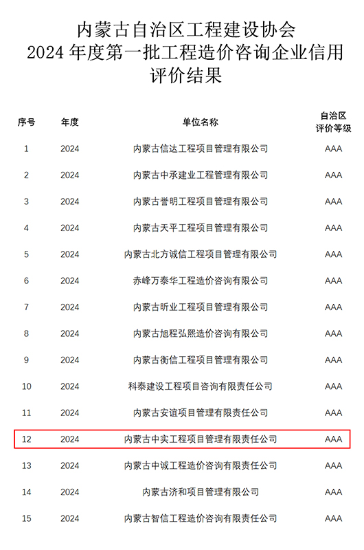 2024-07-3015262 次近期,我公司參加內(nèi)蒙古自治區(qū)工程建設(shè)協(xié)會(huì)組織的“2024年度第一批工程造價(jià)咨詢企業(yè)信用”申報(bào),獲得“信用AAA級(jí)證書”。我公司成立多年以來,遵循中國工程造價(jià)管理協(xié)會(huì)對(duì)造價(jià)咨詢企…